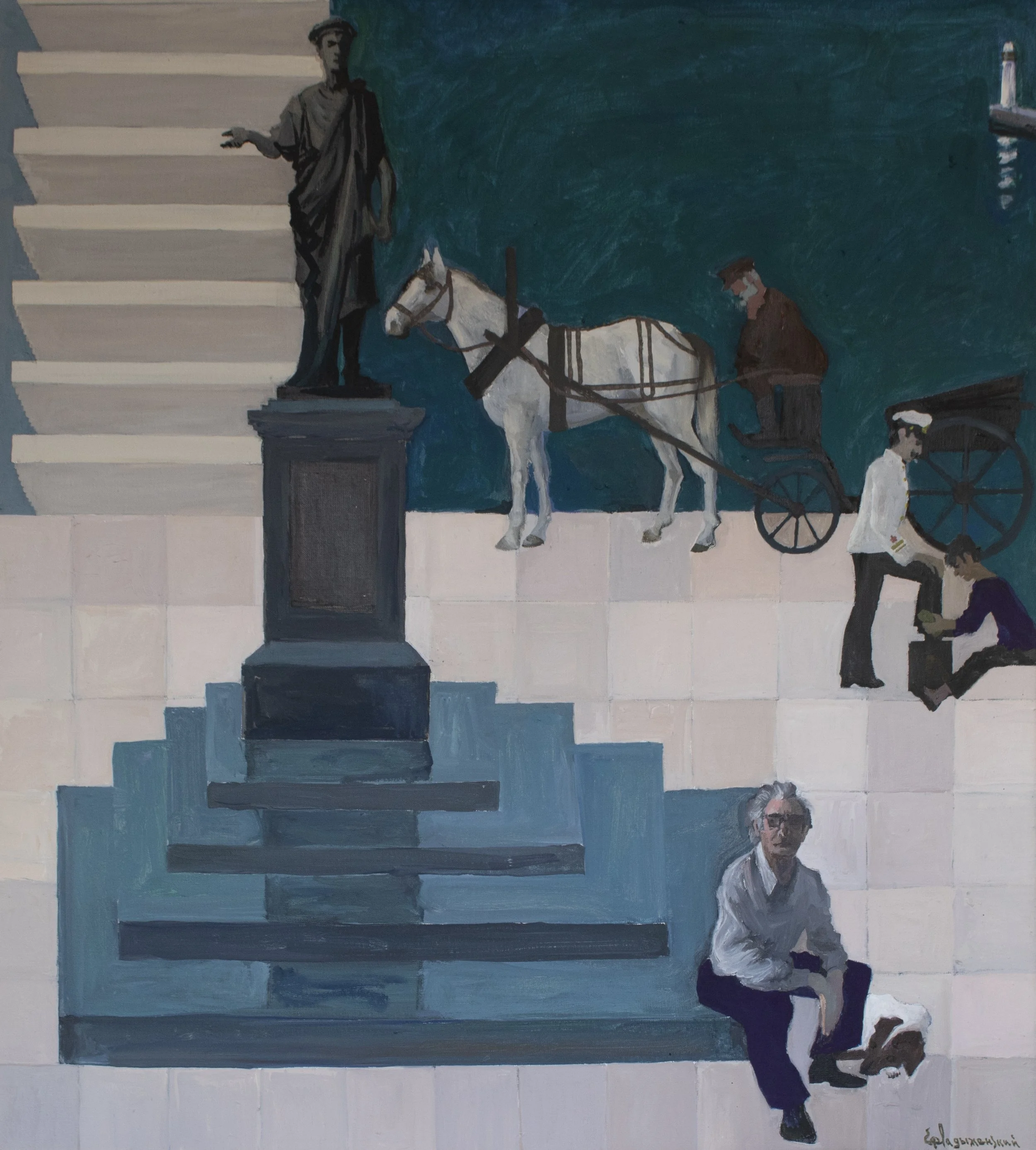 Ladyzhensky paints himself beside the Odessa Steps, which, in this flattened composition, descend upward toward the sea. He sits at the base of a bronze monument to Armand-Emmanuel de Vignerot du Plessis, Duke of Richelieu, and Governor of Odessa from 1803 to 1814. Ladyzhensky’s childhood dog, Belka, lies at his feet.